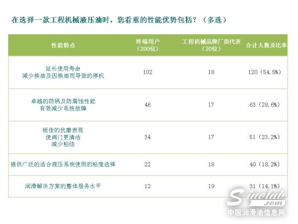 在选择一款工程机械液压油的时候,54.5%的终端用户认为“延长使用寿命,减少换油及因换油而导致的停机”是一款合格液压油最重要的性能特点;28.6%的用户最为关注其是否拥有“卓越的防锈及防腐蚀性能,能够有效减少系统故障”,另外有23.2%的人认为“极佳的抗磨表现,使阀门更清洁,减少粘结”尤为重要。