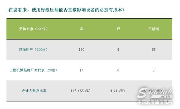 对于使用液压油能否直接影响设备的总拥有成本,65%以上的终端用户认为直接相关,理由是“液压系统的润滑保护直接关系设备的总运营情况”,部分用户表示“说不清楚”。大部分品牌厂商对此表示认同。
