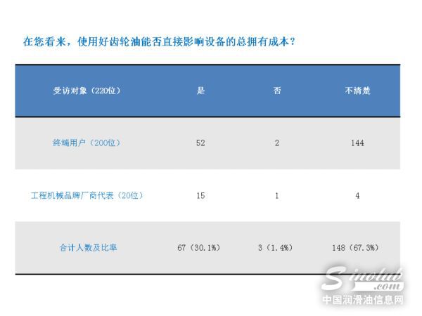 选择一款齿轮油时,80%以上的终端用户都首选其“优秀的负载传递能力和抗磨性能”;对于齿轮油的使用能否关系设备的总拥有成本,72%的终端用户表示“没考虑过”,仅有26%的认为其“能帮助提高设备使用寿命,优化系统效率”,所以与设备的总拥有成本相关。