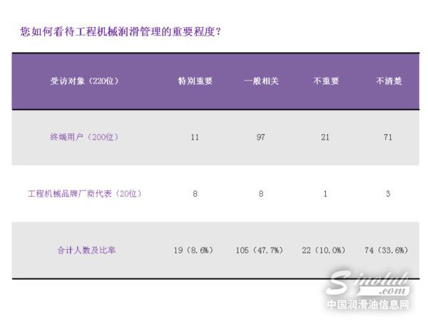对于润滑管理的重要性,认为“一般”的终端用户占了一半以上,四分之一的终端用户表示自己及所在单位正在对润滑相关的总拥有成本进行统计,主要涉及“润滑油采购成本”、“日常保养成本”、“因润滑不良造成的停机及维修成本”等;65%的工程机械厂商代表所在单位十分重视润滑相关的总拥有成本计算,主要集中在“润滑品质对设备全生命周期成本的增值”、“润滑油成本支出及创造效益”、“润滑相关售后服务对机械的具体价值分析”等。