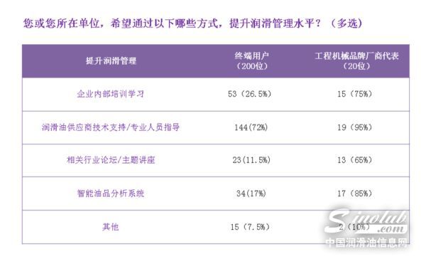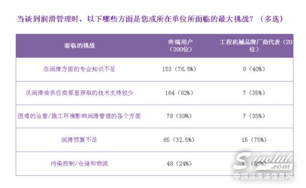 对于如何提升润滑管理水平上,大部分终端用户认为自己面临的最大挑战是“润滑方面的专业知识不足”、“从润滑油供应商直接获取的技术支持较少”,而主机厂商则认为“润滑管理预算不足”、“污染控制/仓储和物流”等挑战较大。