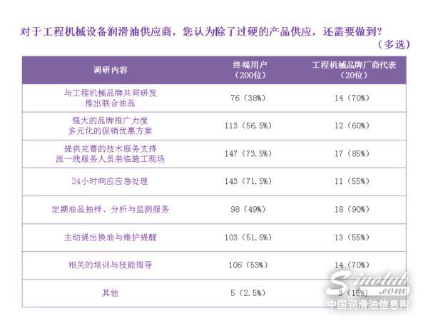 对于工程机械油品供应商,无论是品牌主机厂商还是终端用户都在“品牌的推广与促销政策”、“售后技术支持力度”及“相关培训指导”等方面都抱有较高期望。70%以上的终端用户在24小时应急响应方案方面期待获得更多,对润滑油供应商提供的主动保养提醒也有较大呼声;而工程机械主机厂则期望其润滑油供应商能够针对自身产品特点量身定制润滑解决方案,推出联合品牌油品,同时在定期的油品抽样、分析与监测等方面期望更高。