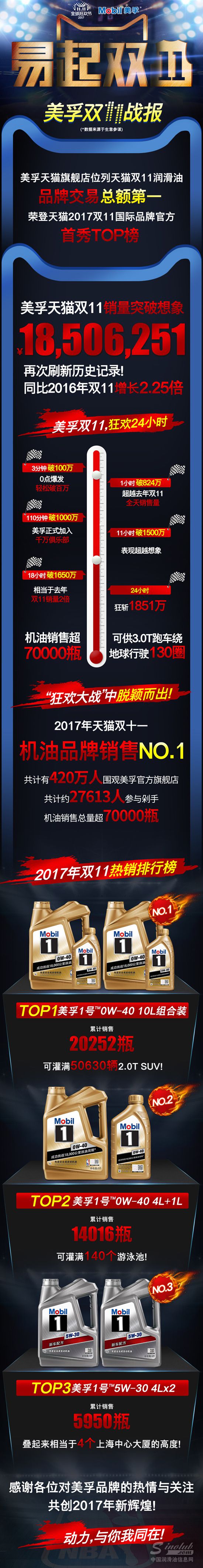 · 共计售出超过70,000瓶美孚润滑油产品,比去年双11增长2.25倍;其中,11月11日零点过后一小时后的销量即超越16年双11店铺全天销售量;