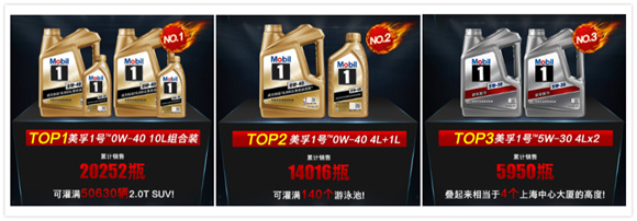 销售报告显示,最受消费者欢迎的产品为美孚1号™0W-40 10L组合装,其次是美孚1号™0W-40 4L+1L产品组合。