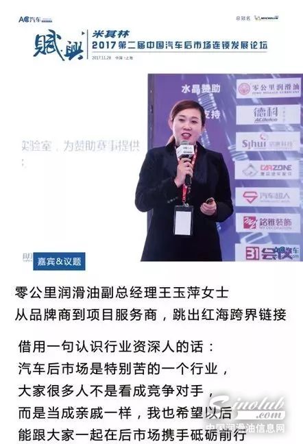 11月28日,在由AC汽车主办、米其林冠名支持的“米其林·2017中国汽车后市场连锁发展论坛”(第三方与维修连锁发展分论坛)上,零公里润滑油公司的副总经理王玉萍女士发表了题目为“从品牌商到项目服务商,跳出红海跨界链接”的演讲。
