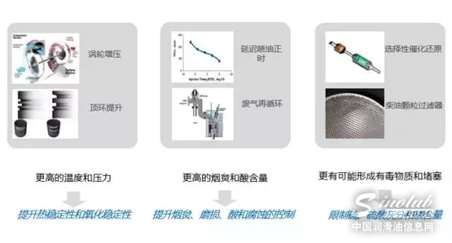 从图表中可见,主要的硬件变化是增加涡轮增压器,推迟喷油正时和EGR(废气再循环系统)。这些硬件设计都对发动机油产生了重要影响。