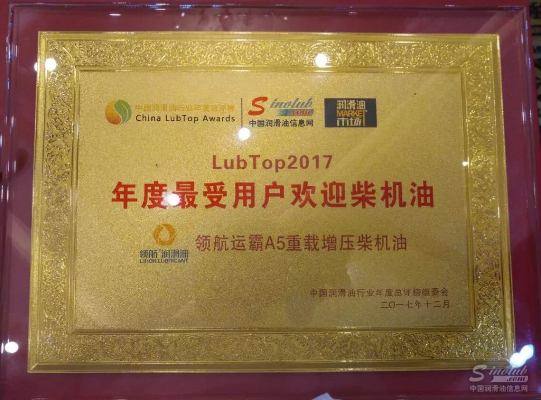 今日,领航润滑油凭借良好的用户满意度、优秀的市场知名度与行业专家的好评,一举获得 LubTop2017中国润滑油行业年度总评榜“中国润滑油行业自主品牌十强”、“年度最受用户欢迎柴机油”两项大奖。