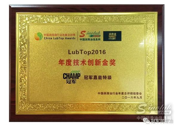 2016年,采用冠军®涡轮增压发动机专利高温保护技术的冠军嘉能®特级酯类合成发动机油,就凭借其全球领先的“高闪点、低挥发”卓越性能获得了“LubTop2016年度技术创新金奖”。
