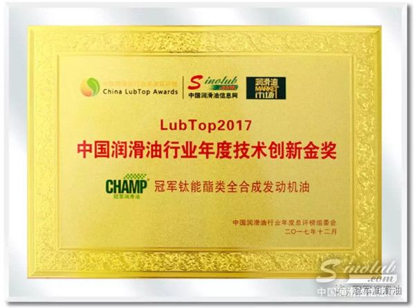 此次颁奖盛典上,冠军®润滑油凭借出色的技术实力和市场表现,勇夺“LubTop2017中国润滑油行业年度技术创新金奖” 和“LubTop2017年度最受用户欢迎自动变速箱油“两项大奖。