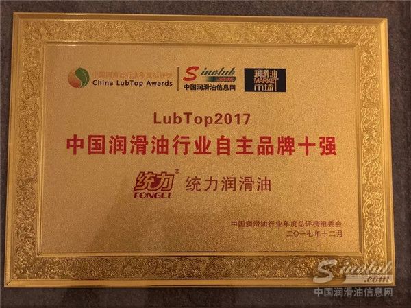 2017年统力完成2亿新目标,并完成十万产能新厂投产基建目标,又再喜获LUBTOP总评榜中国润滑油民族十强称号!