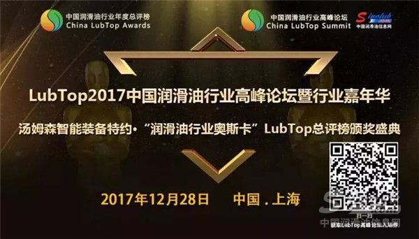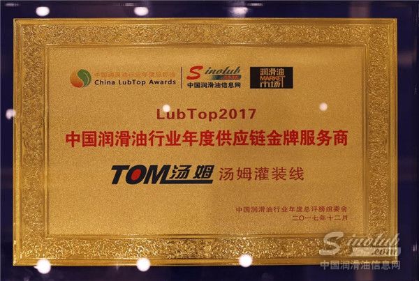 2017年12月28日,由汤姆森智能装备独家冠名的润滑油行业奥斯卡LubTop2017总评榜颁奖在上海隆重举行,汤姆荣获“LubTop2017中国润滑油行业年度供应链金牌服务商”奖项!
