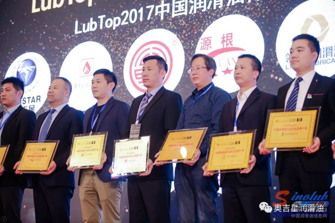 图(右一)“LubTop2017中国润滑油行业自主品牌十强第一名——奥吉星润滑油”