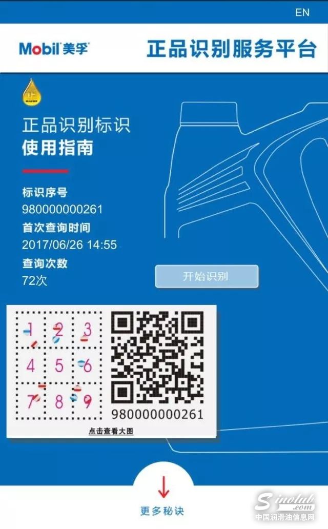 除正品识别标识外,消费者还可通过电话、网络和短信的方式自主地辨别该产品的真伪。关注埃克森美孚官方网站https://www.mobil.com.cn/zh-cn/industrial 上的“美孚®正品识别指南”即可获取更多信息。