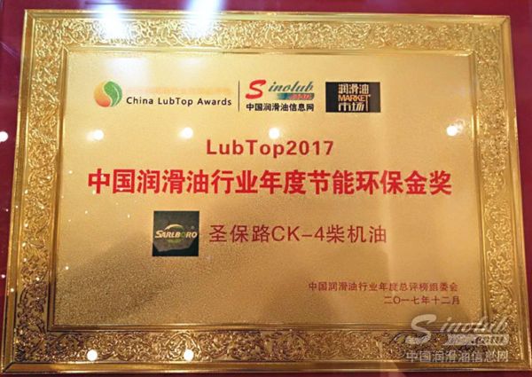 在如此激烈的评选竞争中,圣保路润滑油最终脱颖而出,获得最具含金量的“LubTop2017中国润滑油行业年度节能环保金奖”,再次验证了圣保路润滑油在产品质量、服务模式、营销成果和消费者口碑等各方面的领先实力,以及产品节能环保的重要突出贡献。