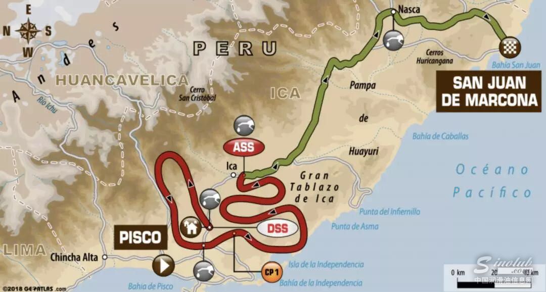 第三赛段从皮斯科出发,终点为圣胡安,赛段前半段即进入了特殊赛段,后半段为常规赛段。卡车组赛段全程504km,其中包括208km的常规赛段以及296km的特殊赛段,特殊赛段中包括CP1一个检查点。