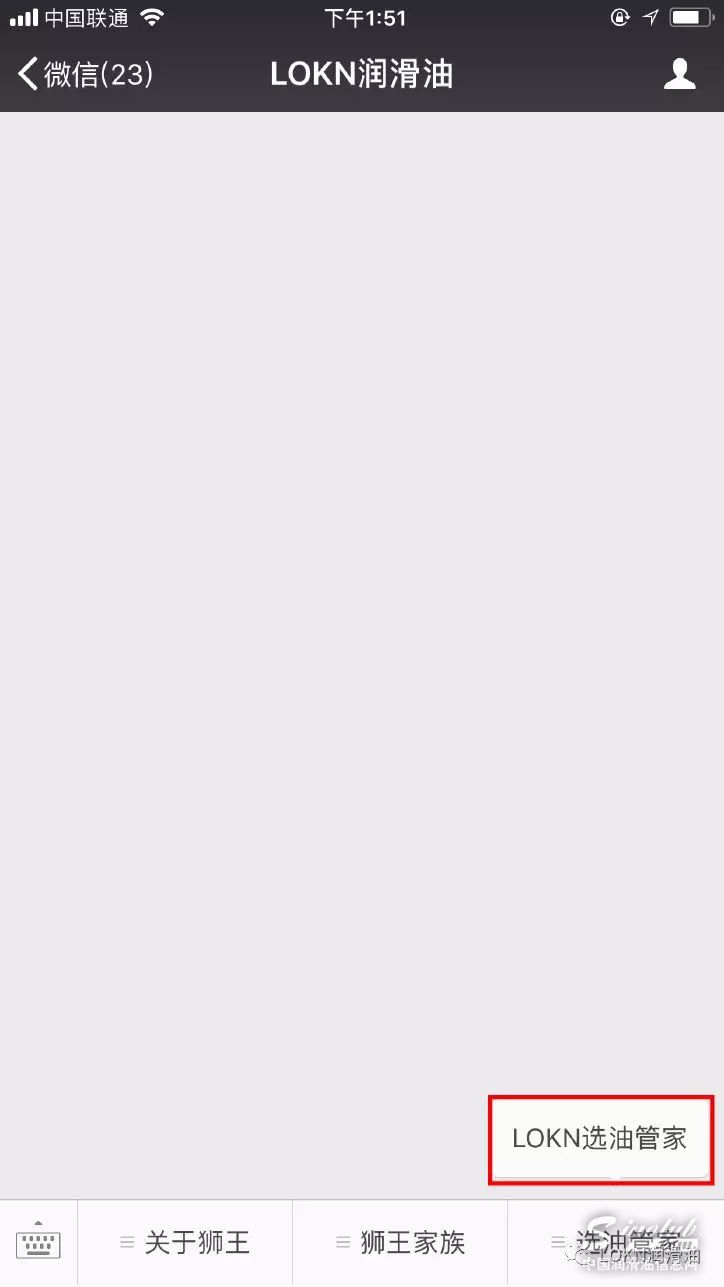 2.进入LOKN润滑油公众号,在下拉菜单“选油管家”处点击“LOKN选油管家”