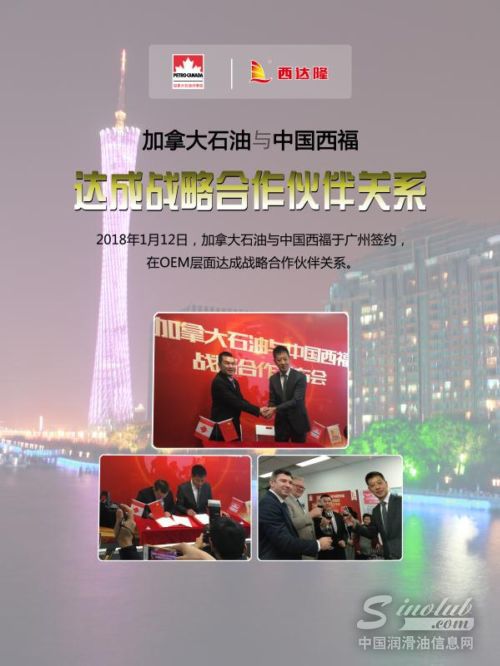 2018年1月12日,加拿大石油和中国西福变速箱联盟在加拿大石油广州分公司总部(广州市珠江新城富力盈凯广场2411室)召开签约仪式,正式就双方在OEM层面上的深度合作签署战略合作协议。加拿大石油亚太兼欧州总裁Martin.Wright、加拿大石油全球市场研发部主管Tony Weatherill、吕承光Alan(中国区总裁)、许银清Jerry(南区总经理)等领导和中国西福联盟荣誉主席温超华、西福联盟全国各省部分会员代表共同出席了本次仪式。