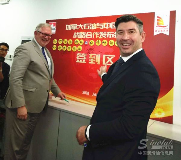 加拿大石油亚太兼欧州总裁Martin.Wright先生(左)和加拿大石油全球市场研发部主管Tony Weatherill先生出席本次签约仪式
