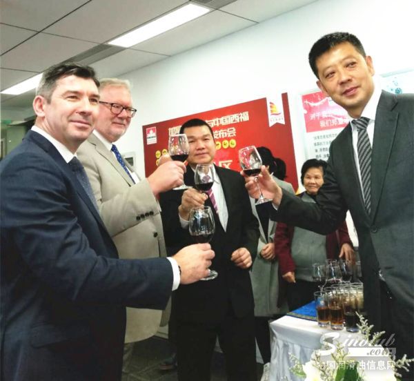 左起:加拿大石油全球市场研发部主管Tony Weatherill、加拿大石油亚太兼欧州总裁Martin.Wright、中国西福联盟荣誉主席温超华、加拿大石油中国区总裁吕承光。四位嘉宾举杯共庆本次合作签约仪式成功举行。
