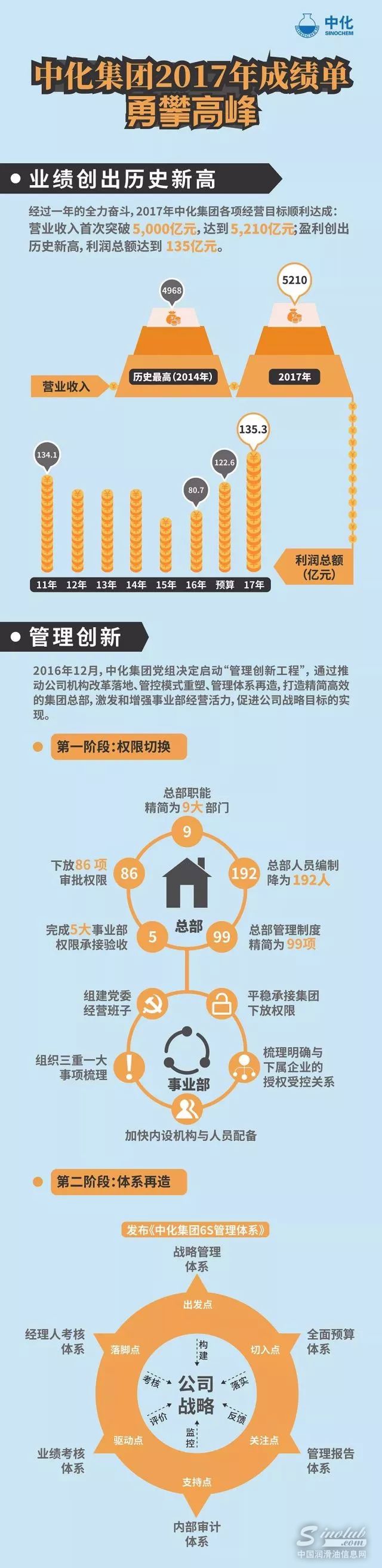 2017年,是极其不平凡、值得铭记的一年,经过全体中化人一年来的努力,我们收获了一份优异的成绩单:2017年,中化集团营业收入首次突破5,000亿元,达到5,210亿元;盈利创出历史新高,利润总额达到135亿元!