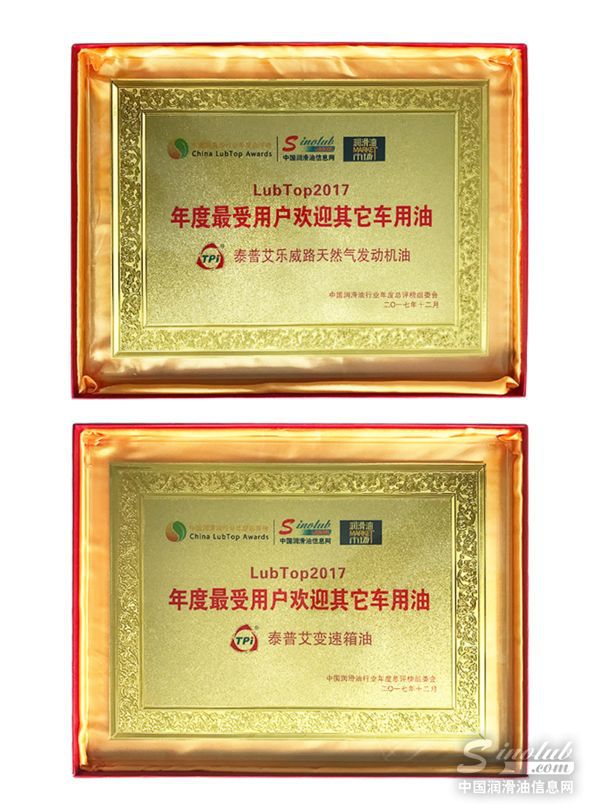 泰普艾一直秉承对中国市场的长期承诺,始终将为中国用户提供高品质的润滑产品作为发展之基,专注产品品质。在LubTop2017中国润滑油行业年度总评榜颁奖典礼上,泰普艾凭借旗下“泰普艾”变速箱油和“乐威路”天然气发动机油两款产品的优异表现,双双斩获“LubTop2017年度最受用户欢迎其它车用油”奖项,成为本届润滑油“奥斯卡”上罕见的“双料冠军”!