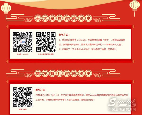 春节到了,意味着春天将要来临,万象复苏草木更新,新一轮播种季节又要开始。在润滑油行业,有一个活动持续十一年,她承载着车主的期待,成为行业的经典嘉年华。值此新春佳节到来之际,作为融入汽车和机械基因的润滑油第一门户,中国润滑油信息网(www.sinolub.com)携手润滑油行业主流品牌企业、行业机构协会、行业大咖、行业用户,倾力推出“玉犬呈祥 名企贺岁 2018中国润滑油行业贺岁金榜”活动,共同向行业和全球华人致以最诚挚的节日祝福。