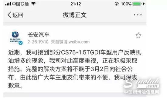对此,长安汽车2月26日晚间就CS75 1.5T车型发动机机油增多事件发出声明,表示已经高度重视,并将在3月5日给出最终的解决方案,并表示给车主带来不便深表歉意。