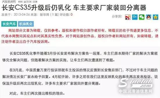 而据新华网在2013年的报道显示,不少车主表示取消旋风式油气分离器后,车辆反映动力下降,提速明显不足,多次出现起步灭车。而且水进入发动机后导致机油润滑效果下降,发动机磨损特别严重等等,由此可见当年长安CS35对于机油乳化问题并没有完全解决。