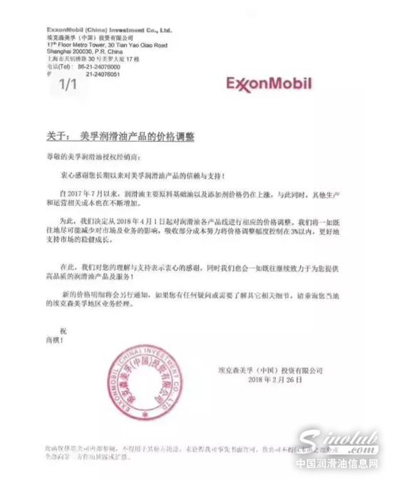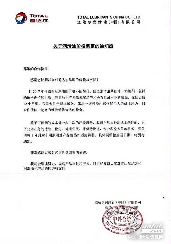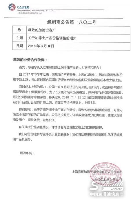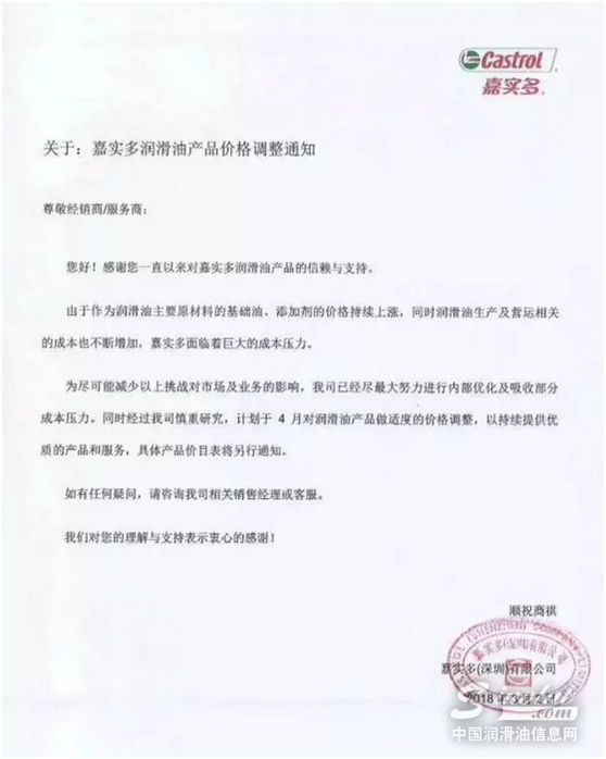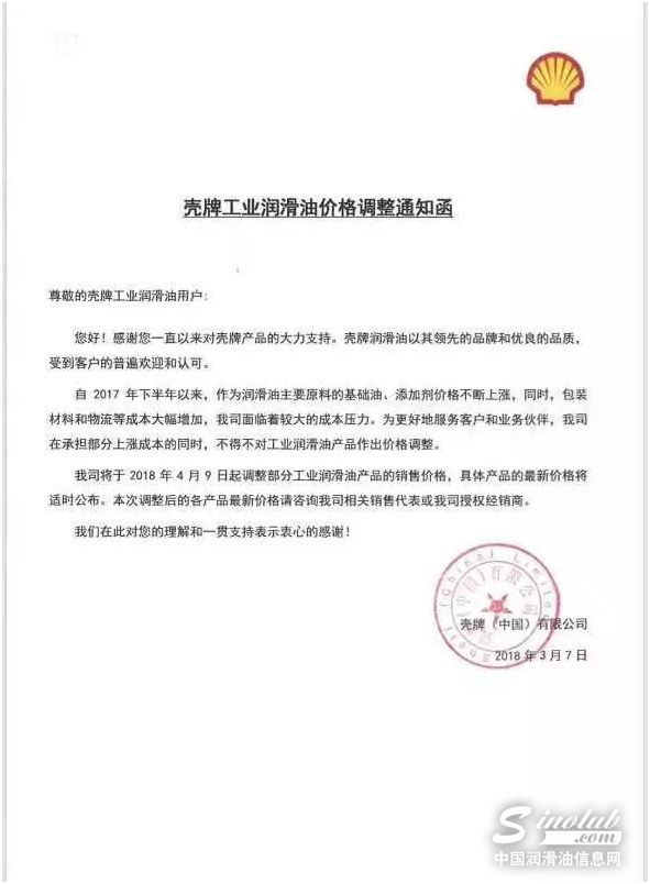 中国润滑油信息网(sinolub.com)从市场获悉,继日前美孚、嘉实多、SK、长城、康普顿、龙蟠、TOP1宣布涨价后,壳牌、道达尔、加德士、GULF海湾润滑油发出润滑油价格调整通知函,将于2018年4月开始执行新的价格表。目前,全球知名润滑油领军品牌美孚、壳牌、嘉实多都称应“成本压力”,“不得不”作出“一个艰难的决定”,宣布涨价。