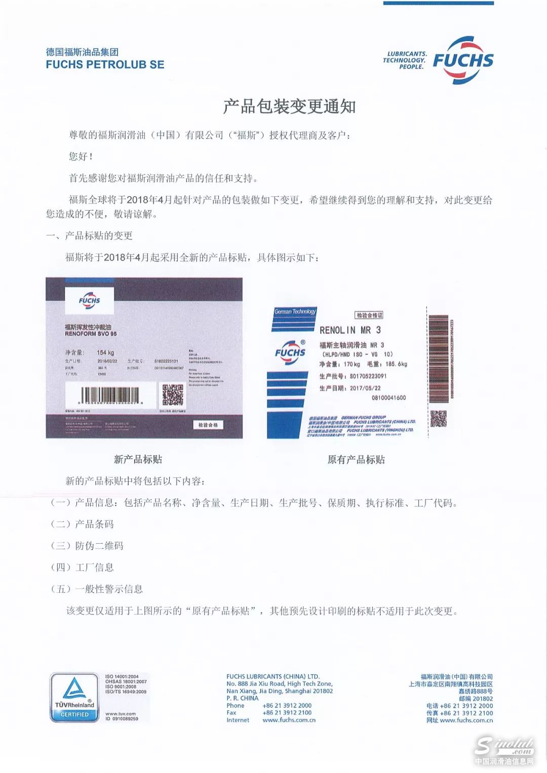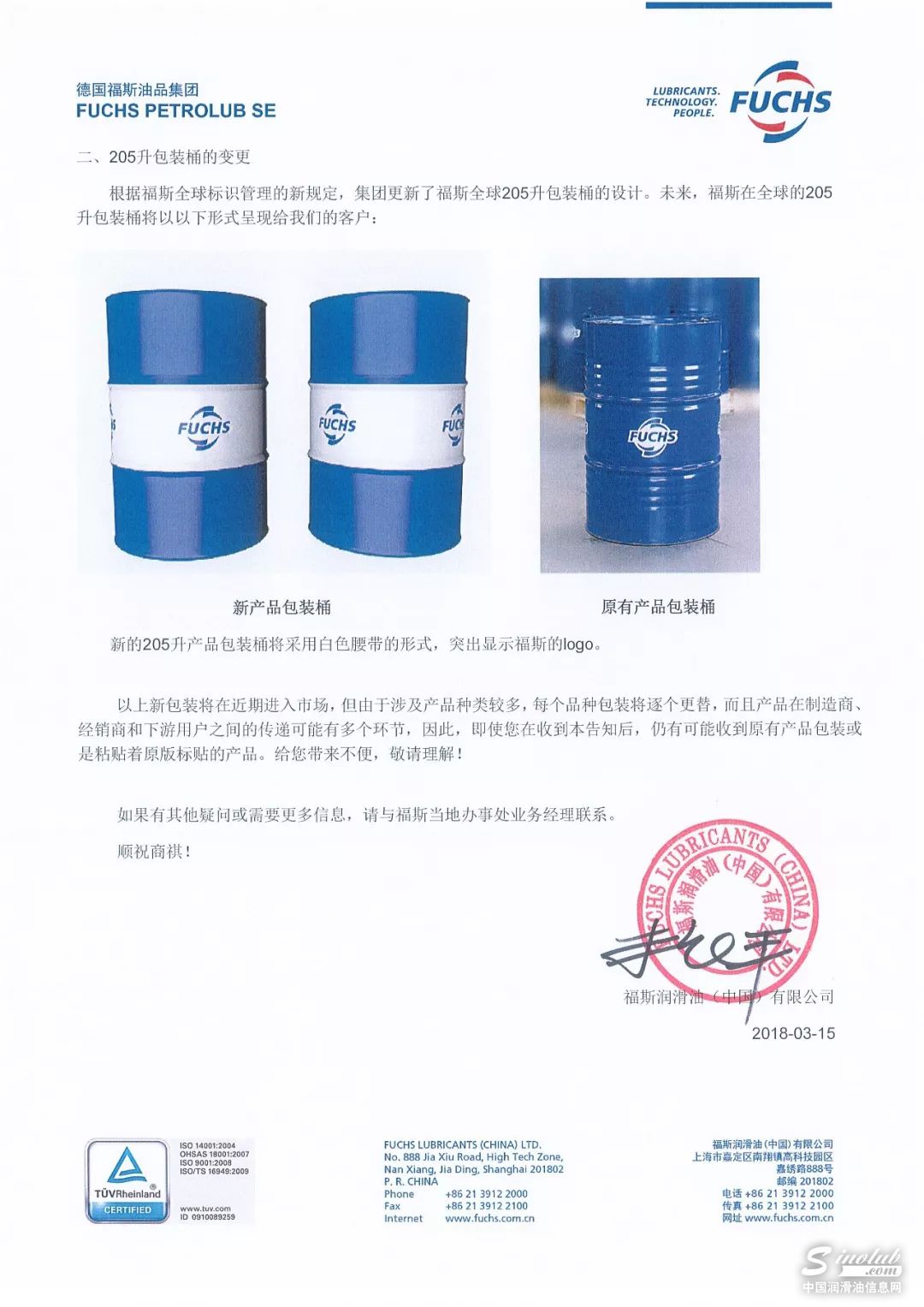 尊敬的福斯润滑油(中国)有限公司(“福斯”)授权代理商及客户:您好!首先感谢您对福斯润滑油产品的信任和支持。福斯全球将于2018年4月起针对产品的包装做如下变更,希望继续得到您的理解和支持,对此变更给您造成的不便,敬...