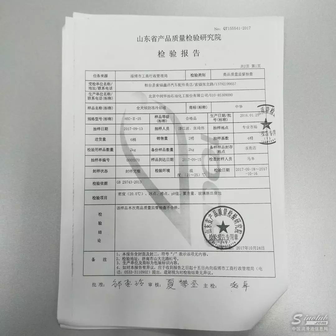 时间倒回2017年12月18日下午。中华公司收到一封来自山东省淄博市工商局快递的质量抽检报告书,标称所抽检的中华牌某2KG防冻冷却液产品,钢铁腐蚀严重超标,被判定为不合格品!