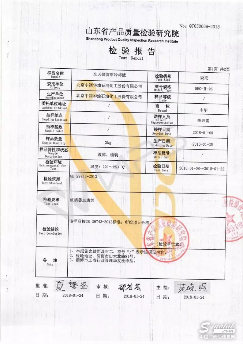 2018年1月24日,复检报告正式出台,报告显示淄博市工商局抽检的中华2kg防冻液产品复检质量完全合格,实验人员和相关领导在合格报告书上郑重签字盖章。也许,因为上一次的检测失误,他们当中的个别人将会担责,将会影响奖金、评级,但是,面对“中华”的真诚和正派,他们没有任何怨言地签了字,还“中华”产品质量以清白!云雷在和检测院相关人员依依惜别时,深深向他们鞠了一躬,代表公司对他们的科学和严谨精神表达崇高的敬意!