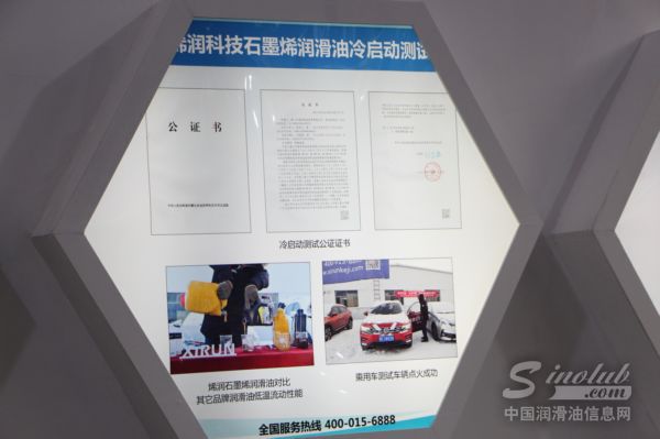 2017年12月26日,烯润科技在呼伦贝尔进行了石墨烯润滑油低温冷启动性能测试。测试车辆在当地零下35摄氏度的环境下放置24小时后,全部一次启动成功,该测试取得了呼伦贝尔市公证处公证书。另一组使用普通润滑油的对比测试车辆则未能成功点火,证明了石墨烯润滑油的低温冷启动性能要远远优于普通润滑油。