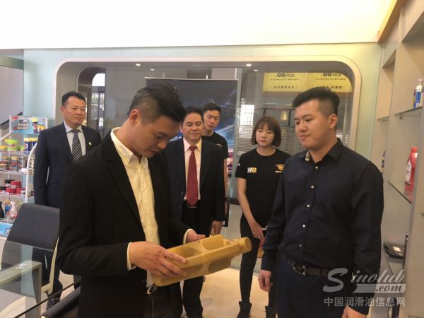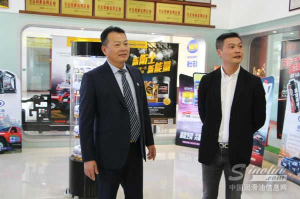 卫士石油董事长林学腾(左)陪同硬虎赛车创始人沈伟健(右)考察卫士石油公司