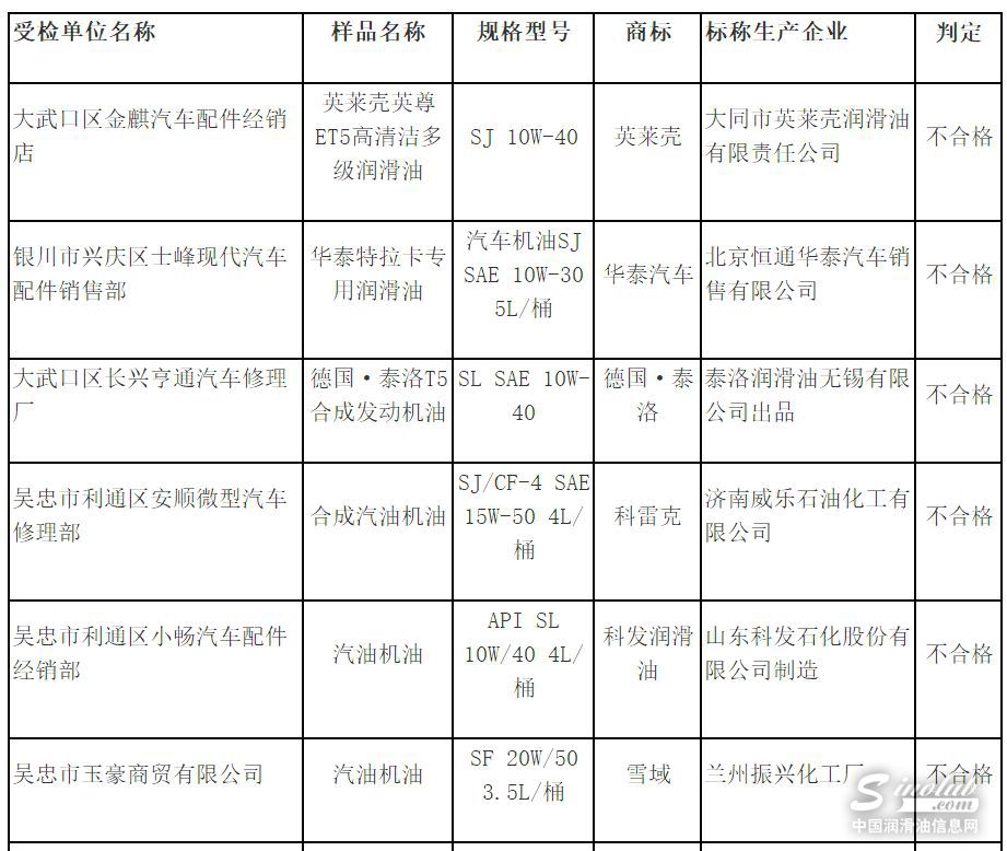 据介绍,在2017年流通领域汽车配件类商品质量抽检工作中,自治区工商行政管理局对银川市、石嘴山市、吴忠市的100个批次的刹车片、机油商品进行了抽查检验。经检验,合格94个批次,不合格6个批次,合格率为94%。从检验结果来看汽车刹车片商品质量全部合格,机油类商品质量涉及的主要不合格项目为运动黏度和低温动力黏度不符合相关标准要求。机油机油黏度对车辆有什么影响呢?据悉,机油黏度太高会因为油膜太厚使机油黏滞使得阻力增加,进而产生不良的影响,比如车辆较难发动、加速迟缓,或者车辆变得较“吃油”,使得燃料浪费等;而机油的黏度太低的话同样也会对发动机有不良影响,可能致使油膜厚度不够,油膜强度差,容易被破坏,在高温、高压的摩擦表面上不易形成足够厚度的油膜,使机件得不到正常的润滑,造成发动机的过度磨损等等。