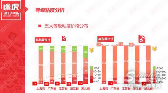 另外一个吸睛看点,便是湖北市场的消费能力。在《报告》五大等级黏度价格分布数据统计图中,我们可以看出, 1L包装尺寸机油价格在上海、广东、江苏、浙江等东部沿海市场的表现,依旧同全国市场的价格集中度类似,保持在80~90元之间。但作为内陆区域市场,湖北省的机油消费价格分布相较下来更为高端,高达32%售出产品价格高出90元,这是大约是其他四个区域市场的2倍。