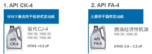 API CK-4和FA-4是API柴机油序列史上第一次分割出的两套并行规格。API CK-4和FA-4最大的差别在于高温高剪切值,前者大于3.5cP,而后者为2.9至3.2cP。API CK-4可向下兼容用于较老式的发动机,取代API CJ-4,它包含15W-40、10W-30、5W-30和5W-40粘度;另一边API FA-4主要用于新型发动机,为燃油经济型机油类别,包含10W-30和5W-30粘度。