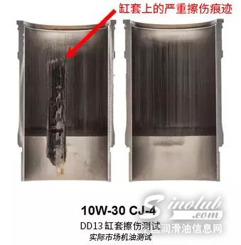 当机油的粘度降低,油膜的厚度随之会变得更薄,与之相伴随地会产生更复杂的流动和界面效应。此时,发动机油的配方中就需要更多加强磨损保护性能。所以优异的磨损保护是应用低粘度机油的前提条件。路博润对此在DD13发动机上做了和API CJ-4级别的对比测试,发现应用10W-30粘度的API CJ-4油品的缸套上会在早期就出现严重的擦伤痕迹,而使用路博润配方API CK-4和FA-4油品,发动机缸套上出现擦伤的时间是标准限制的6倍之多。“很多API CJ-4规格的机油都设计于10年以前,对新硬件的适用性就会显得捉襟见肘。”