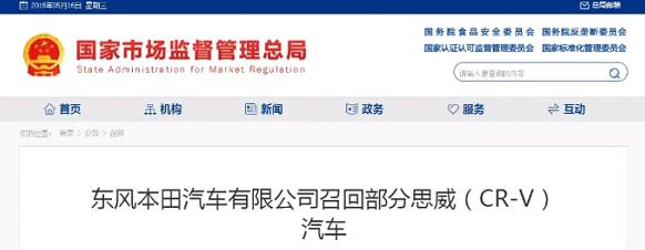 根据《缺陷汽车产品召回管理条例》和《缺陷汽车产品召回管理条例实施办法》的要求,东风本田汽车有限公司向国家市场监督管理总局备案了召回计划,决定自2018年5月22日起,召回2017年2月14日至2018年2月27日生产的搭载1.5T发动机的部分2018款CR-V,共计130455辆。