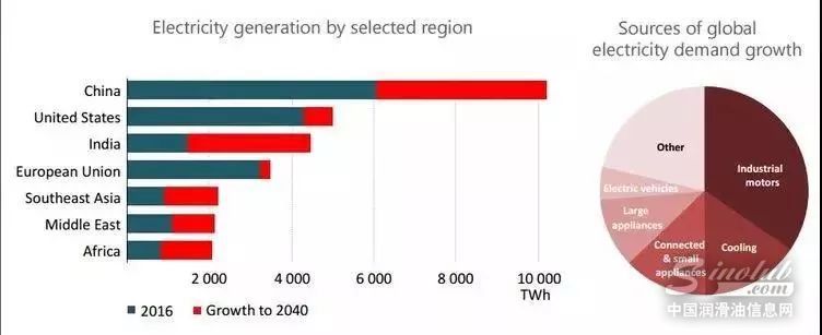 图4:IEA2016-2040年各国发电装机量以及电力使用情况