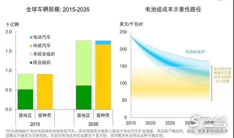 图5:BP2015-2035年全球车辆规模以及电池组成本示意图