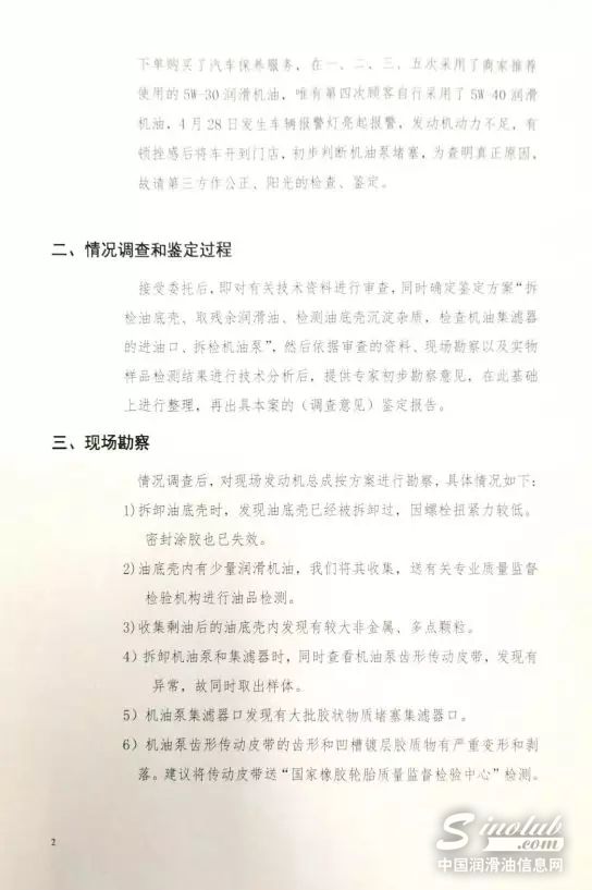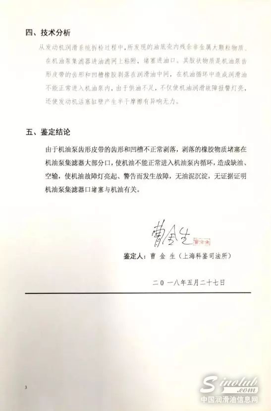 途虎养车和车主成先生共同委托上海科鉴司法鉴定所的专家进行故障原因检测。上海科鉴司法鉴定所的专家曹金生在拆解发动机后,认定故障原因是车辆正时齿状传动皮带(简称“正时皮带”或“传动皮带”)碎屑掉落导致机油泵堵塞。同时检测报告显示,无证据证明机油泵集滤器口堵塞与机油有关。