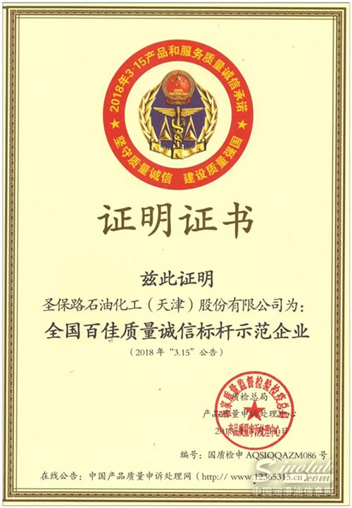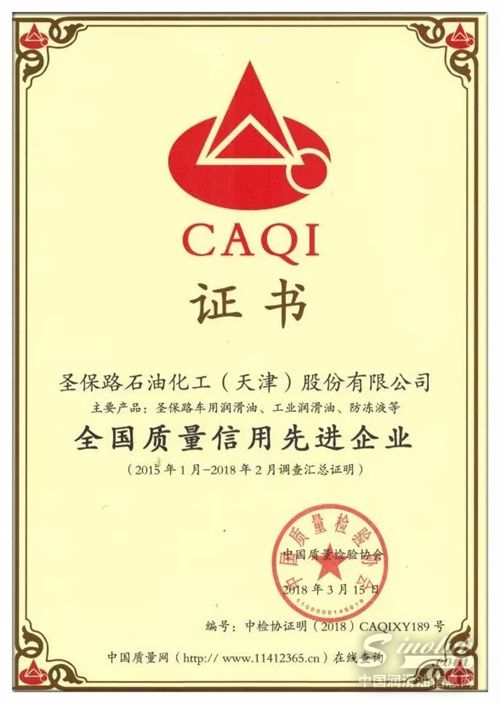 此次圣保路经过国家质检总局和中国质量检验协会严格审查和层层筛选,最终荣获“全国百佳质量诚信标杆示范企业”、“全国质量信用先进企业”,两项殊荣是对圣保路在产品技术、服务水准等方面的高度认可,也凸显了圣保路在润滑油行业里的领先地位。