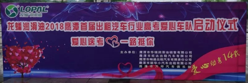鹰潭经销商联合鹰潭市旺达出租汽车有限公司 、鹰潭市畅通出租汽车有限责任公司 、鹰潭市丽华小汽车出租有限公司以及鹰潭市万邦汽车俱乐部,共同启动龙蟠润滑油2018鹰潭首届出租汽车行业高考爱心车队活动。