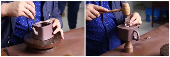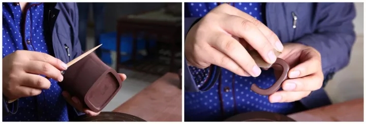 首先做好壶身,经过精修细改之后外表光滑如玉; 精修壶和壶把,别看小部件,实为画龙点睛之笔。