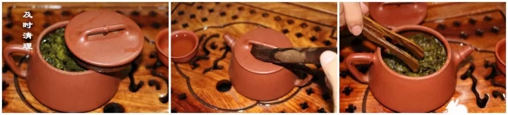 在泡茶的过程中,用棉质的带有所泡茶汤的湿茶巾对壶体进行擦拭,可有效促使茶壶变得干净整洁。经常获得茶汤的滋养,能够促使茶壶胎质发生变化。注意,在用茶巾擦拭之时,要谨慎为之,不可过度猛擦。对有些“工”有曲线 和“流涎”造型的壶,要注意及时擦拭流下部的茶汤。以免长期因保养不善造成壶整体“包浆”的缺陷。对壶的流、把转接处,壶盖的内口外沿、壶钮等转接处要细心擦拭,这些 “偏僻处”容易积垢,会影响茶壶的整体养护效果。