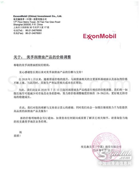 据中国润滑油信息网(www.sinolub.com)最新获悉,2018年6月13日,埃克森美孚(中国)投资有限公司在致美孚润滑油经销商的函件表示,“随着原有价格的提升,与润滑油相关的主要原料基础油以及添加剂价格不断上涨,与此同时,其他生产和经营相关成本也在增加”。“为此,我们决定2018年7月13日起对润滑油各产品线进行相应的价格调整”。