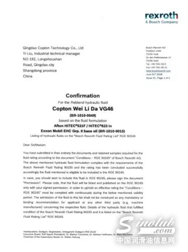 日前,康普顿威力达抗磨液压油在国内率先通过了博世力士乐Bosch Rexroth 90235认证。这是继获得帕克丹尼森PARKER DENISON HF-0 HF-1 HF-2的全系列认证和法孚Fives P-70认证(原辛辛那提认证)后,康普顿威力达抗磨液压油又一次获得的高规格认证。