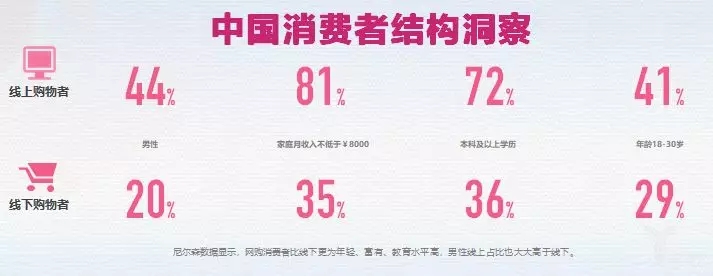 首先,这是一组尼尔森调查的数据,通过这个基础结论,我们看得到一个趋势,我们现在需要去抓住这些更高学历、更年轻、更富有的消费者,满足他们线上的需求。