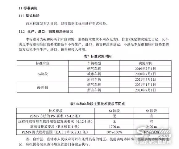 自本标准发布之日起,即可依据本标准进型式检验。自2019年7月1日起,所有生产、进口、销售和注册登记的燃气汽车应符合本标准要求;自2020年7月1日起,所有生产、进口、销售和注册登记的城市车辆应符合本标准要求;自2021年7月1日起,所有生产、进口、销售和注册登记的重型柴油车应符合本标准要求。